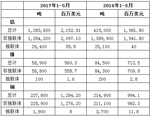 以下為俄羅斯聯(lián)邦海關(guān)服務機構(gòu)(FCS)提供的2017年1-5月鋁、鎳和銅出口量數(shù)據(jù):