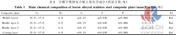 采用10kg真空熔煉爐在0.1kpa的真空條件下熔煉并澆鑄出3種不同硼含量的高硼不銹鋼芯料,將芯料置于澆鑄模內(nèi),從鑄模的上澆口中澆入作為覆層的普通不銹鋼,使之包覆在芯料周圍,制備出尺寸為120mm×100 mm×80mm,硼含量分別為2.0%~2. 5%、3.0%~3.5%、4.0%~4.5%的復(fù)合材料坯料。包覆澆鑄后的坯料在1150℃下經(jīng)過鍛造及350型可逆熱軋機上的熱軋變形,軋制成最終厚度為3mm左右的不銹鋼復(fù)合板。軋制變形時,最初2道次的壓下量為20%~30%,使鑄態(tài)組織充分破碎,隨后壓下量降低至15%左右,每4~5個道次回爐重新加熱。