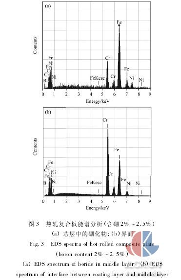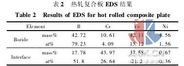 對熱軋后芯層中的硼化物及復(fù)合板界面處進行了eds分析,結(jié)果如圖3及表2所示。芯層中硼化物的b含量達到42.72%,原子分數(shù)達到79.23%,根據(jù)fe-b二元相圖[8],判斷該物相的成分中含有fe2b相。芯層中的硼化物除含有較多的fe 外,還含有一定量的cr、ni。cr元素由于是易形成碳化物的元素,而且具備生成cr-b化合物的熱力學(xué)條件,因此推斷該相中cr的存在形式有兩種: cr的碳化物和cr2b,綜上可知芯層塊狀硼化物的主要成分為: cr的碳化物,fe2b和cr2b。界面處硼含量較低,但cr含量較高,說明界面處的組織仍主要是α-fe基體相,但界面附近存在有少量由芯層越過界面擴散到覆層而形成的二次硼化物。