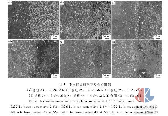 圖4為1150℃下,2、4、6h退火,高硼不銹鋼/普通不銹鋼復(fù)合板界面組織。從圖4中可看到,高溫下,由于界面兩側(cè)的整體硼含量差別較大,硼原子有將跨過界面向覆層擴散的趨勢。此時,擴散的主要驅(qū)動力應(yīng)該是界面兩側(cè)奧氏體基體中硼原子濃度差引起的自由能梯度。但是,復(fù)合板是經(jīng)過熱軋變形的,含硼不銹鋼芯層中的一部分硼原子已經(jīng)擴散到了界面的另一側(cè),因此,此時擴散的主要驅(qū)動力則是覆層普通不銹鋼基體在界面附近和遠離界面的區(qū)域硼原子的濃度差提供的。硼原子在基體中的溶解度非常低,而且覆層不銹鋼中的硼化物含量也極低,這就導(dǎo)致了硼原子在覆層中的擴散速率隨之降低[9]。