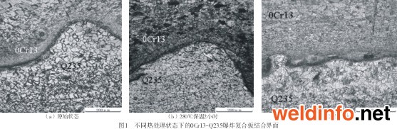 在壓力容器行業(yè)中,特別是一些用于化學(xué)工業(yè)的設(shè)備,由于長期在具有腐蝕性的環(huán)境中服役,因此對其制造材料的耐腐蝕性能有很高的要求。如果用單一的耐腐蝕材料進行制造,雖然滿足了使用要求,但是大大提高了生產(chǎn)成本??梢钥紤]在保證材料強度和使用性能的前提下,通過在價格相對便宜的基板上復(fù)合一層耐腐蝕板材來達到降低成本的目的[1]。 本文以0Cr13不銹鋼-Q235碳鋼爆炸不銹鋼復(fù)合板為試驗對象,研究了不同熱處理時長對其結(jié)合界面在組織形態(tài)、元素擴散及顯微硬度等方面的影響,為確定合適的熱處理時間提供了理論指導(dǎo)。